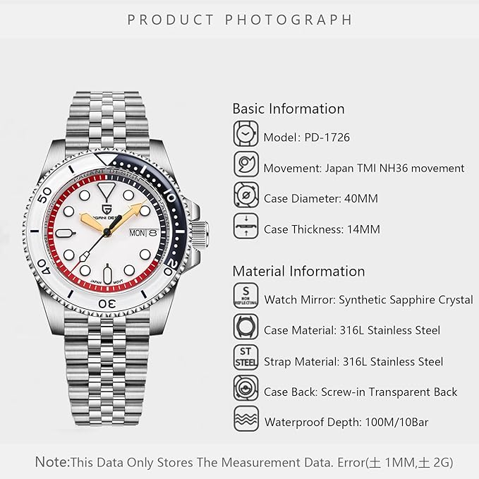 The Pagani Design PD-1726 men’s automatic dive watch features a 40mm stainless steel case, offering both durability and sleek style. The high-quality super-luminous dial, bezel, and crown glow brightly in the dark, ensuring easy readability in any lighting. Powered by the NH36 automatic mechanical movement, it delivers precise, stable performance and a long lifespan, with a day and date display for convenience.